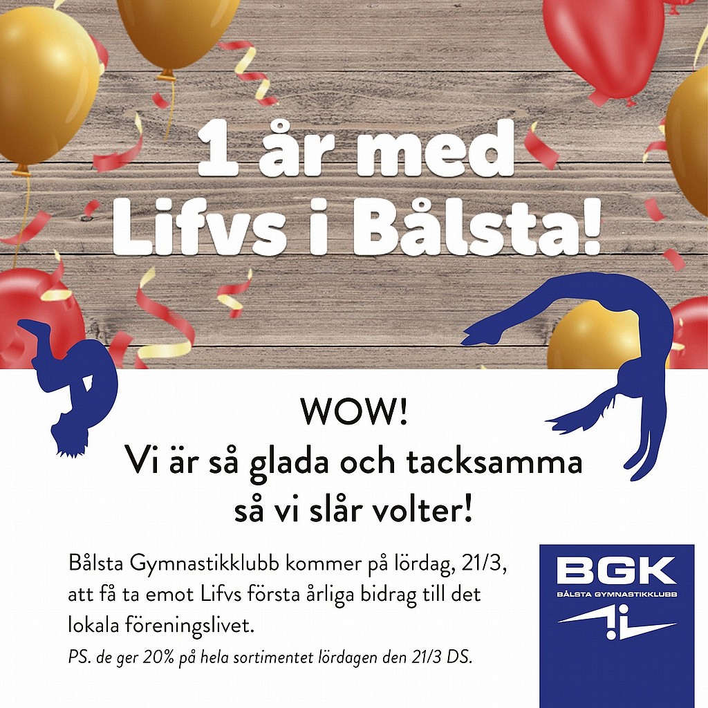 På lördag 21 mars firar Lifvs 1 år i Bålsta. Varje år kommer Lifvs att dela ut ett ekonomiskt bidrag till det lokala föreningslivet och vi i BGK har utsetts till årets vinnare! Kom och fira med oss, kl 13.00 mottar vi priset tillsammans! PS Passa på att bekanta er med butiken på Gåsholmsvägen, Frösundavik (20% rabatt hela dagen!)